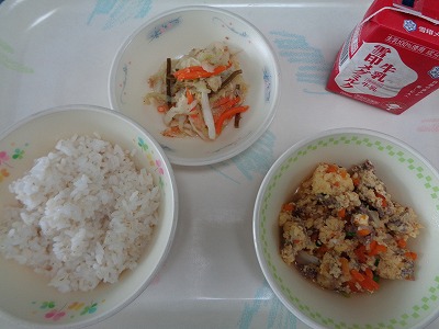 今日の献立は,「麦ごはん・牛乳・他人煮・ごま酢煮」でした。