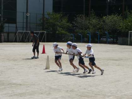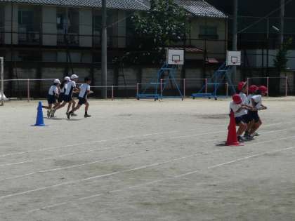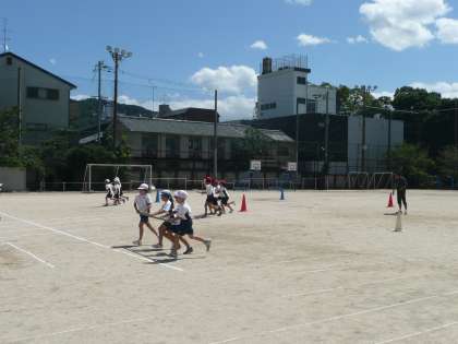 4年生は団体競技で「台風の目」を行います。同じ色の友だちと作戦を考えながら練習を進めています。
