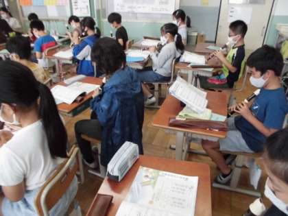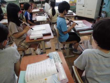 全体でリコーダーの練習をした後,二人ペアでお互いに見合っています。