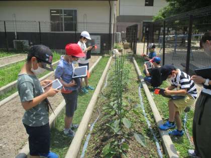 目で見たり,触ってみたりして観察する他に,タブレットも活用して野菜の成長した様子を見つけました。