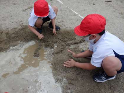 運動場に出て,たくさんの水や砂を使った学習をしました。