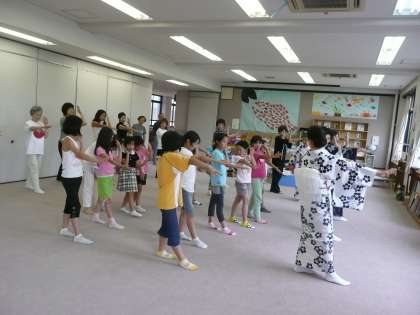 8月11日(火)にみやこメッセで行われる江州音頭フェスティバルの練習が始まりました。今日は午後4時から本の広場で地域の女性会の方に踊り方を教えていただき,円になって音楽に合わせて踊りました。子どもたちは,どの子も踊り方を覚え,楽しそうに練習していました。