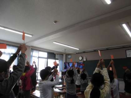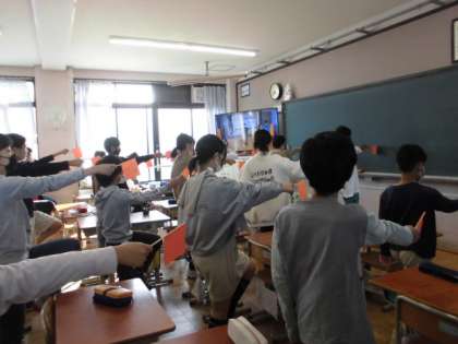 細かな部分を徹底するには,運動場より体育館,体育館より教室ですが,教室では,あの大きな旗は危なくて振れません・・・と思うのではなく,振れるサイズの旗を作ればいい!ということで,教室では,ミニフラッグで練習しています。