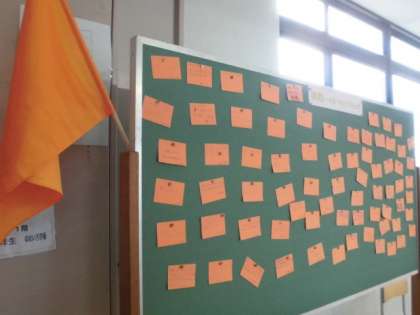 学年の掲示板に,ひとりひとりが,フラッグにかける思いのカードを書いて貼っています。