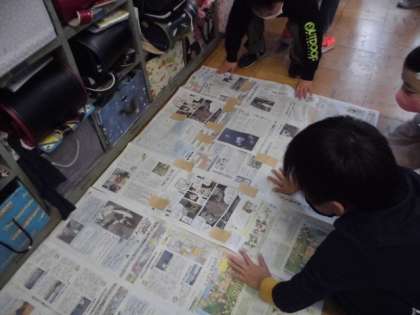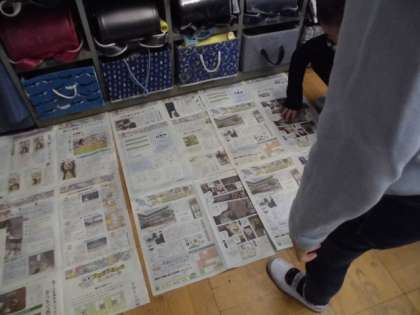 今日は,グループごとに,新聞紙をつなぎ合わせて,実寸大の1平方メートルを作りました。