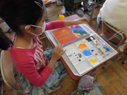 図画工作科の『コロコロガーレ』の学習では,台板と枠棒に色を塗り始めました。