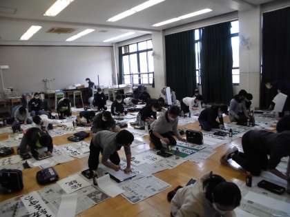 教室とはちがう,広々とした場所で,いつもとはちがう姿勢で,のびのびと書きました。