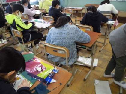 下絵をもとに,台紙を切り,色セロハンを貼る段階に入りました。