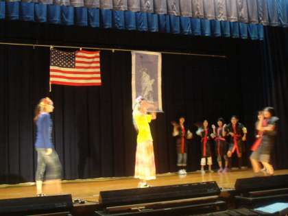 6年2組は江戸時代にさかのぼって武士たちがアメリカへわたります。扮装や小道具などに工夫を凝らしています。最後はみんなで歌を歌います。