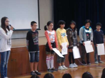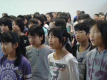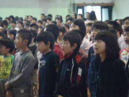 校長先生のお話の後,図書委員会や計画委員会からお知らせがありました。最後に,後期の歌「気球に乗ってどこまでも」を全校児童で歌いました。