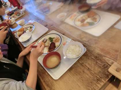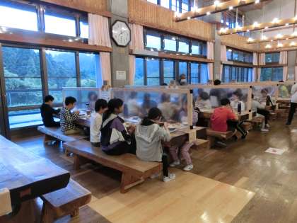 さて,5年生は,午後からの活動を終え,入浴も済ませて,食堂で夕食をいただいています。しっかりたっぷり活動した後なので,おなかもペコペコ。みんな,しっかりいただいています。