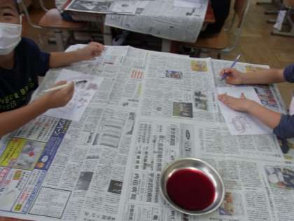 と,子ども達は楽しそうに,色水をつかって絵を描いていました。
