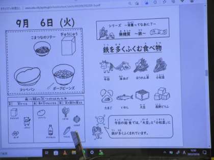今日の献立は、「ポークビーンズ」「小松菜のソテー」「コッペパン」「牛乳」でした。