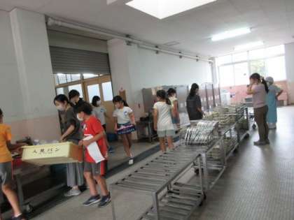 給食時間が終わると、各クラスから給食当番の子たちが、続々と食缶や食器などを返しにきます。