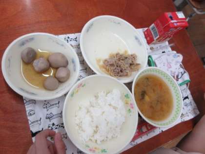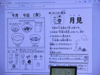 今日は、お月見の行事献立、「ぶたにくとこんにゃくのいために」「さといものにつけ」「みそしる」「ご飯」「牛乳」でした。
