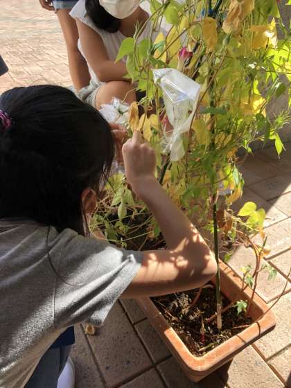 仮説「受粉することで実ができ,種子ができ,子孫を残すことができる」の検証のための受粉実験です。