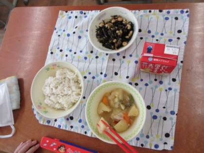 今日の献立は、「けいにくとやさいのにつけ」「ひじきまめ」「むぎご飯」「牛乳」です。