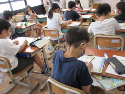 「工場で作られるもの」の学習で、地域教材の生八つ橋を題材として学習しています。