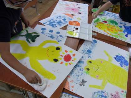 初めてのコンテをはさみで上手に削ったり,絵の具のスタンプも