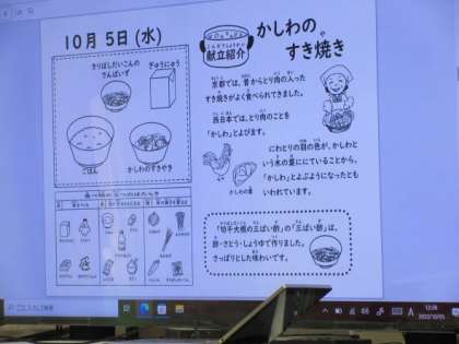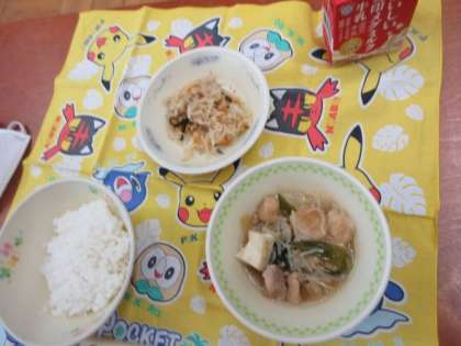 今日の献立は、「かしわのすきやき」「切干大根の三杯酢」「ご飯」「牛乳」です。