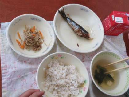 今日の献立は、「いわしの変わり煮」「もやしのごまいため」「すまし汁」「麦ご飯」「牛乳」です。