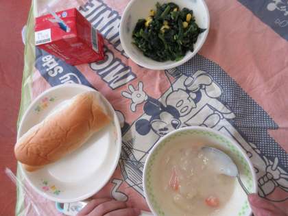 今日の献立は、「じゃがいものクリームシチュー」「ほうれんそうのソテー」「あじつけコッペパン」「牛乳」です。
