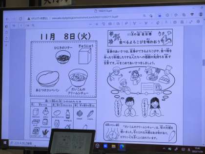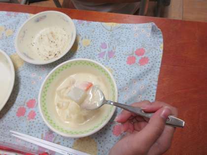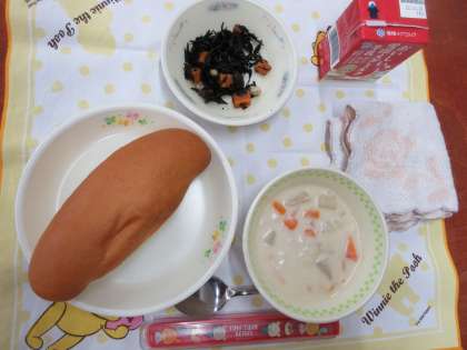今日の献立は、「だいこんのクリームシチュー」「ひじきのソテー」「あじつけコッペパン」「牛乳」です。