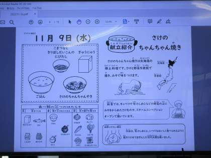 今日の献立は、「さけのちゃんちゃんやき」「こまつなときりぼしだいこんのにびたし」「ご飯」「牛乳」です。