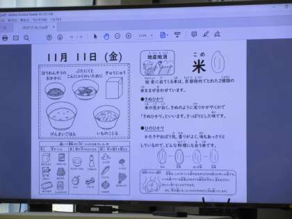 今日の献立は、「ぶたにくとこんにゃくのいために」「いものこじる」「ほうれんそうのおかかに」「げんまいごはん」「牛乳」です。