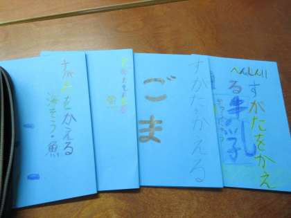 教材分の学習の後、自分で食べ物を選んで、「へんしん巻き物」を書きました。
