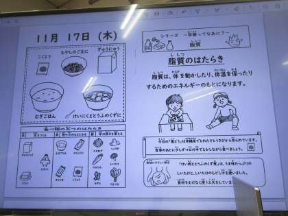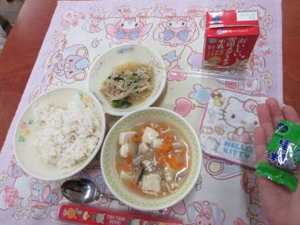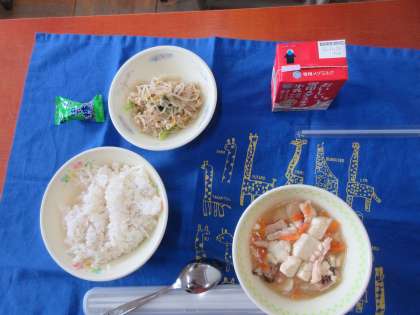 今日の献立は、「けいにくととうふのくずに」「もやしのごまに」「むぎご飯」「牛乳」「こくとう」です。