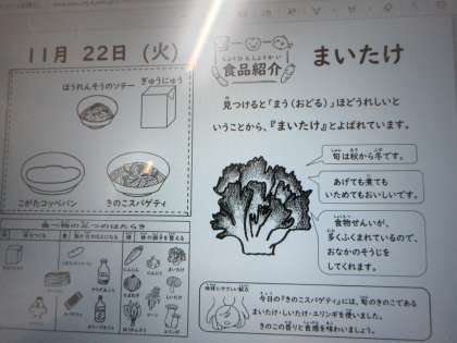 今日の「きのこスパゲティ」には、しいたけ、エリンギ、まいたけが使われています。