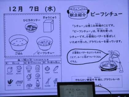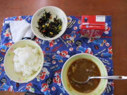 今日の献立は、「ビーフシチュー」「ひじきのソテー」「ご飯」「牛乳」です。