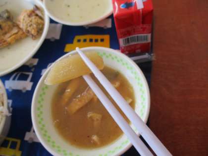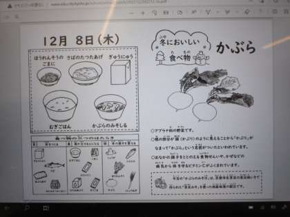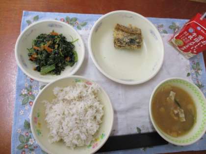 今日の献立は、「さばのたつたあげ」「ほうれんそうのごまに」「かぶらのみそしる」「麦ご飯」「牛乳」です。