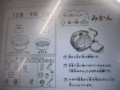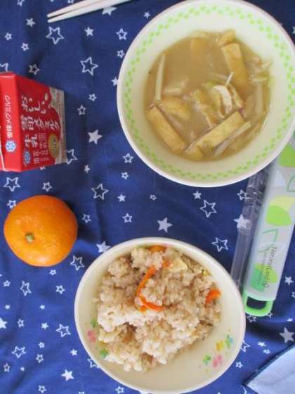 本日は台風献立、「たきこみごもくご飯」「みそしる」「牛乳」「みかん」です。