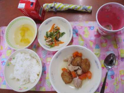 今日の献立は、「ひらてんとこんにゃくのにつけ」「こまつなのにびたし」「フルーツかんてん」「ご飯」「牛乳」です。