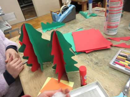 絵画作品が仕上がった子から、クリスマスツリーのペーパークラフトをしました。