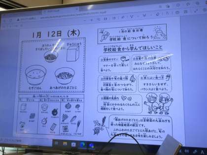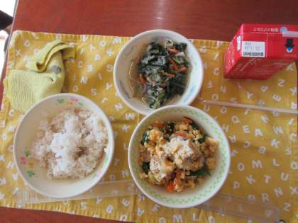 今日の献立は、「あつあげのたまごとじ」「ほうれんそうときりぼしだいこんのごまに」「むぎご飯」「牛乳」です。