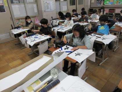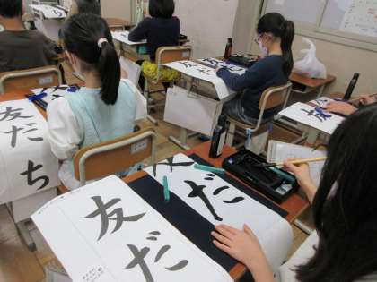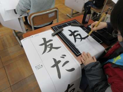 「友だち」の三文字を、画仙紙にバランスよく配置するのは、なかなか難しい。