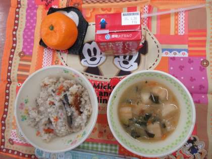 今日は、災害に備えた献立、「ツナごぼうご飯」「みそしる」「みかん」「牛乳」です。