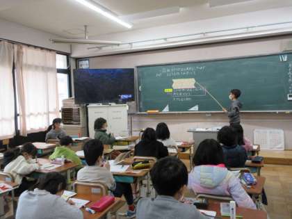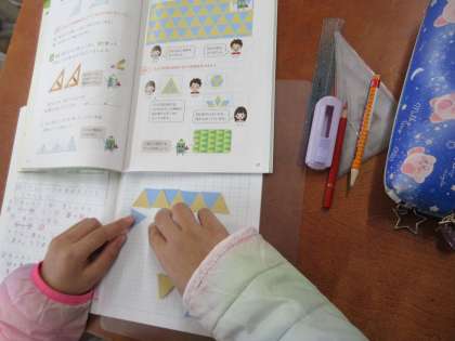 ただ、しきつめて貼って、「わあ,きれい。」で終わると、図工ですが、そこからいろいろな形を見つけたり、なぜ正三角形といえるのかを考えたりするのが算数学習ですね。