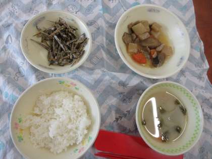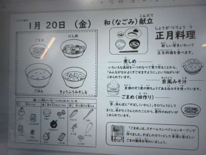 「にしめ」「ごまめ」「京ふうみそしる」「ご飯」、すべてお正月料理です。