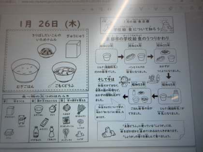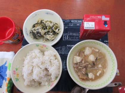 今日の献立は、「ごもくどうふ」「きりぼしだいこんのいためナムル」「むぎご飯」「牛乳」です。
