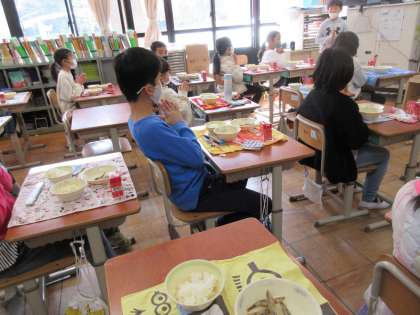 今日の献立は、「きびなごのこはくあげ」「とうにゅうなべ(うどんいり)」「げんりょうご飯」「牛乳」です。