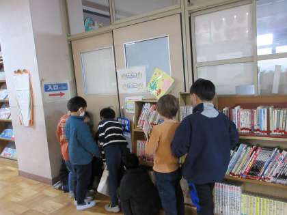 中間休みが始まると、低学年の子たちがさっそく学校図書館に列を作っています。