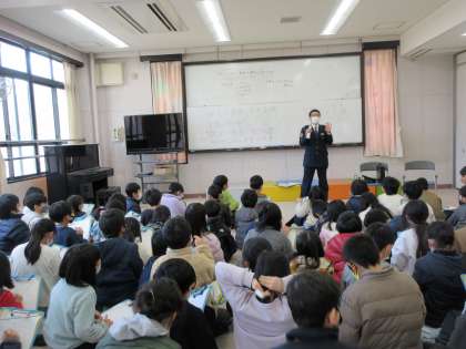 「事故や事件をふせぐ」の学習で、今日は川端警察署の方をゲストティーチャーとしてお招きし、貴重なお話を聞かせていただきました。
