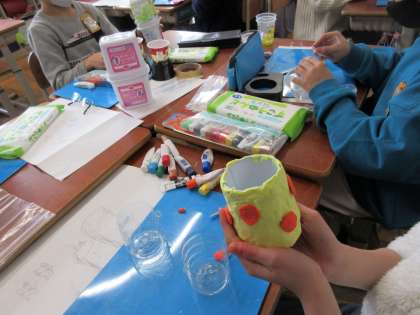 入れる物を考えて、空き容器に粘土をつけながら変身させます。