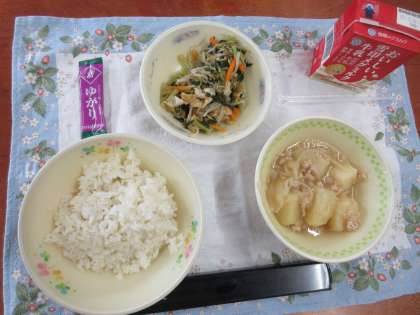 今日の献立は、「じゃがいものそぼろに」「もやしのにびたし」「ふりかけ(しそ)」「むぎご飯」「牛乳」です。