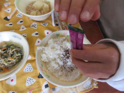 今日は、しそのふりかけもついていて、ご飯の香りも色も味もアップしました。