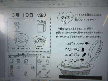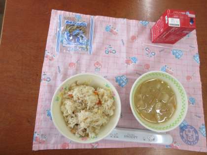 今日は災害備蓄献立、「たきこみごもくごはん」「みそしる」「じゃこ」「牛乳」です。